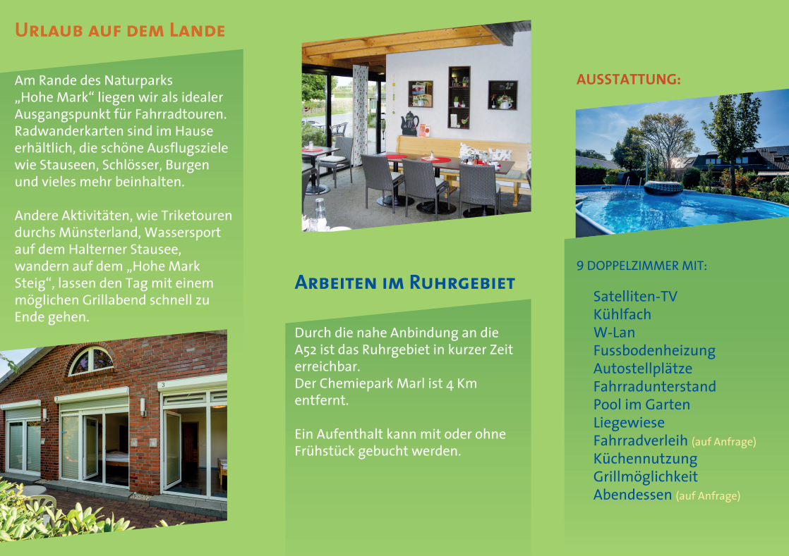 Am Rande des Naturparks „Hohe Mark“ liegen wir als idealer Ausgangpunkt für Fahrradtouren. Radwanderkarten sind im Hause erhältlich, die schöne Ausflugsziele wie Stauseen, Schlösser, Burgen und vieles mehr beinhalten. Andere Aktivitäten, wie Triketouren durchs Münsterland, Wassersport auf dem Haltener Stausee, wandern auf dem „Hohe Mark Steig“, lassen den Tag mit einem möglichen Grillabend schnell zu Ende gehen.